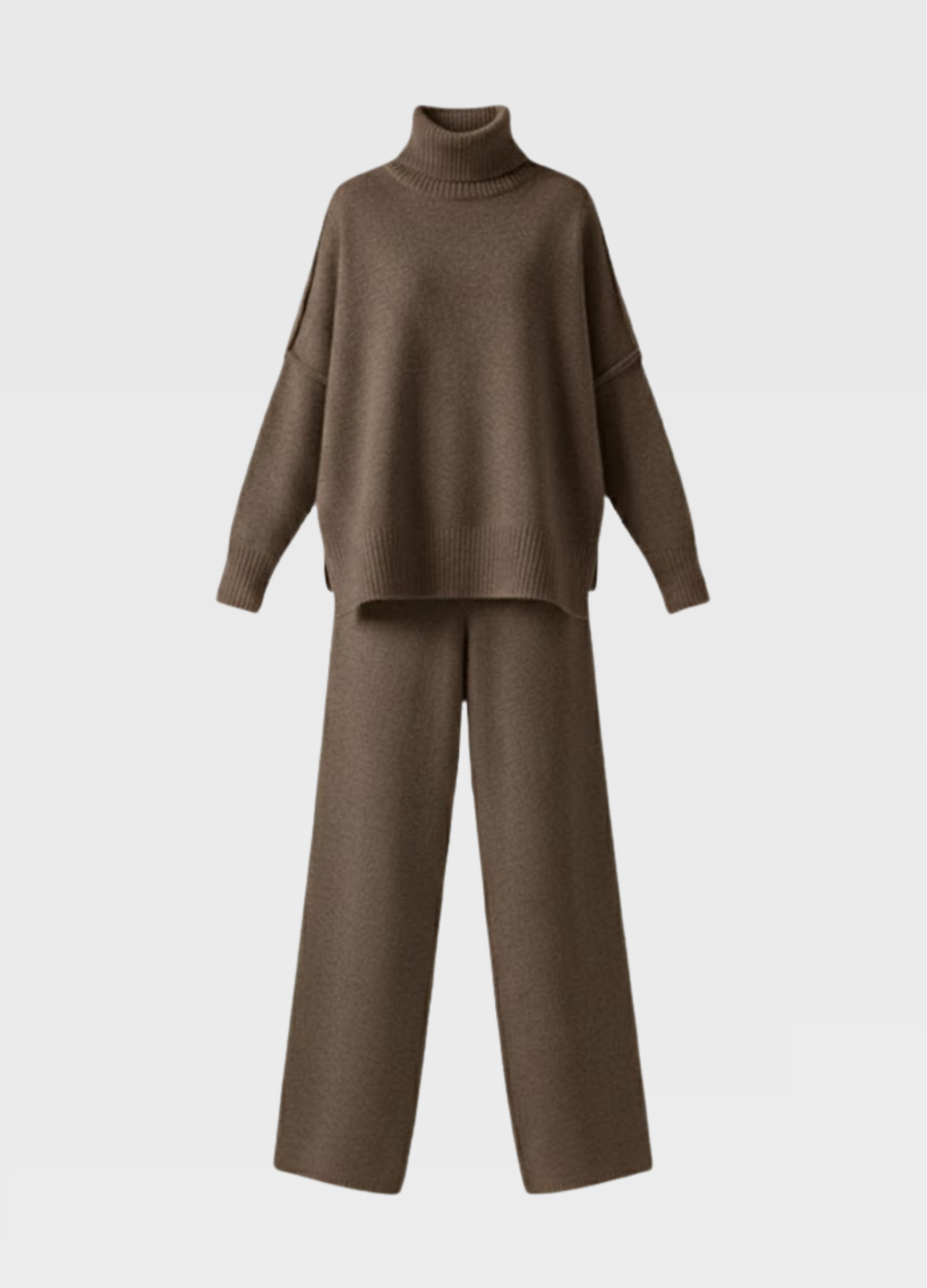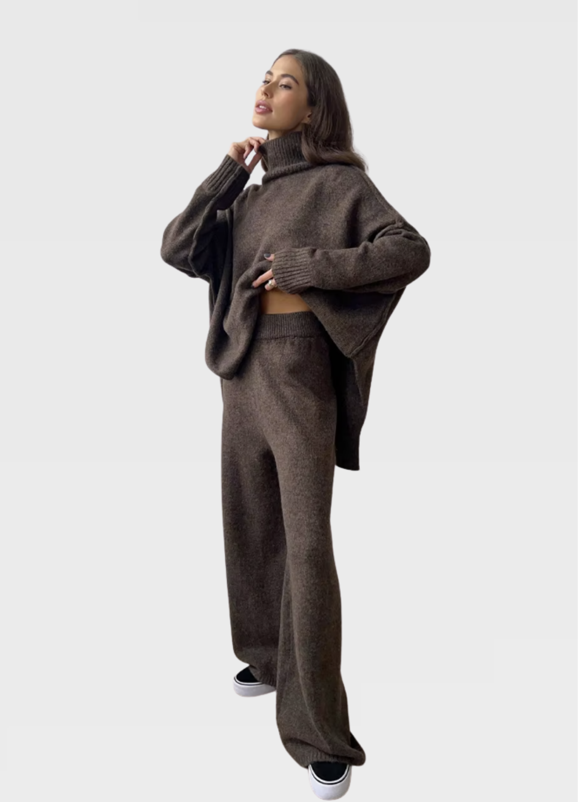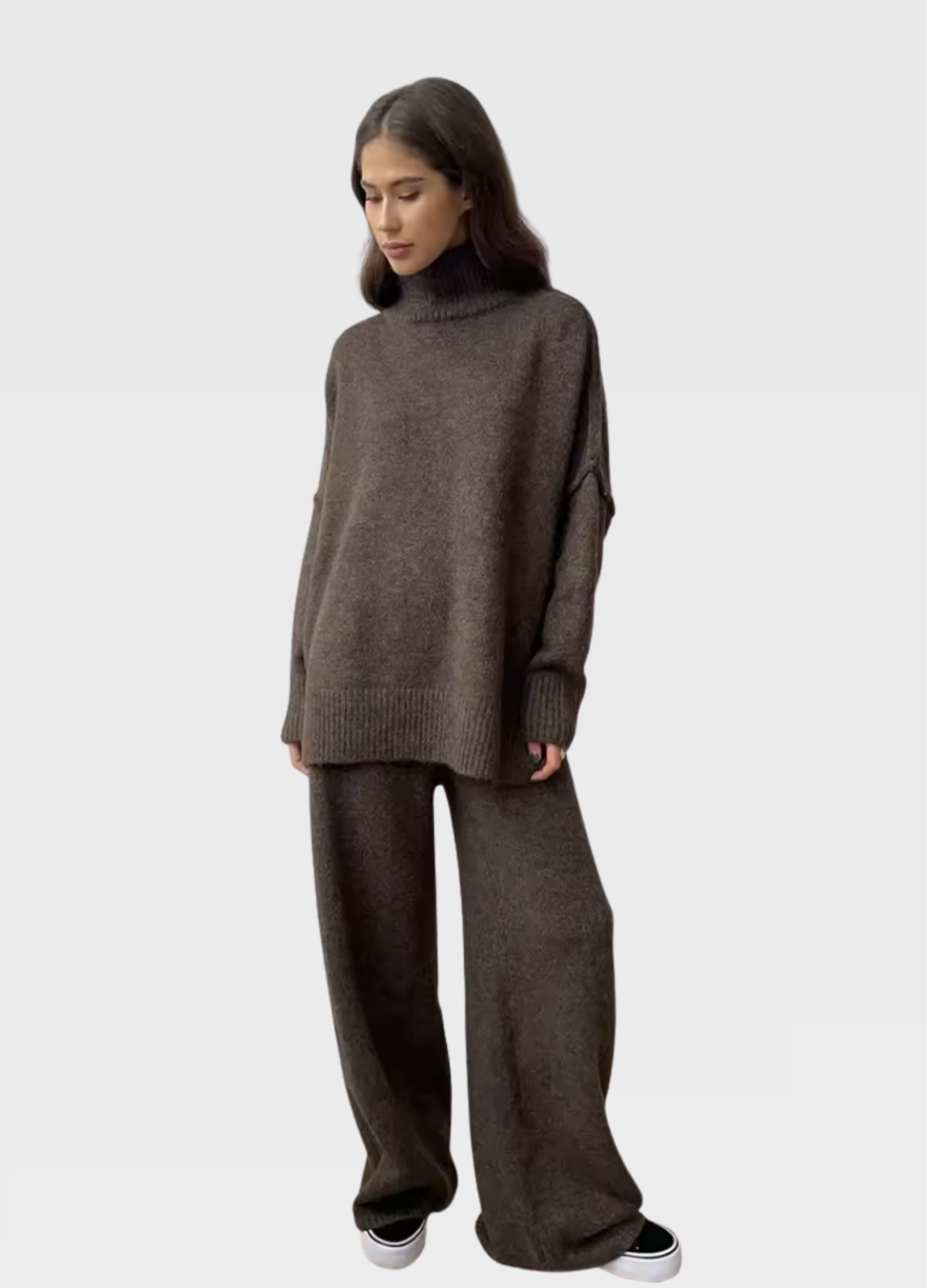 Kvalitná pletenina poskytuje dostatočné teplo bez toho, aby bola ťažká, čo robí túto súpravu ideálnou na nosenie doma aj vonku. Je vhodná na bežný deň, pohodlný domáci outfit či štýlový vzhľad pri rôznych príležitostiach. Súprava pôsobí moderne, nadčasovo a okamžite sa stane obľúbeným kúskom v každom šatníku.