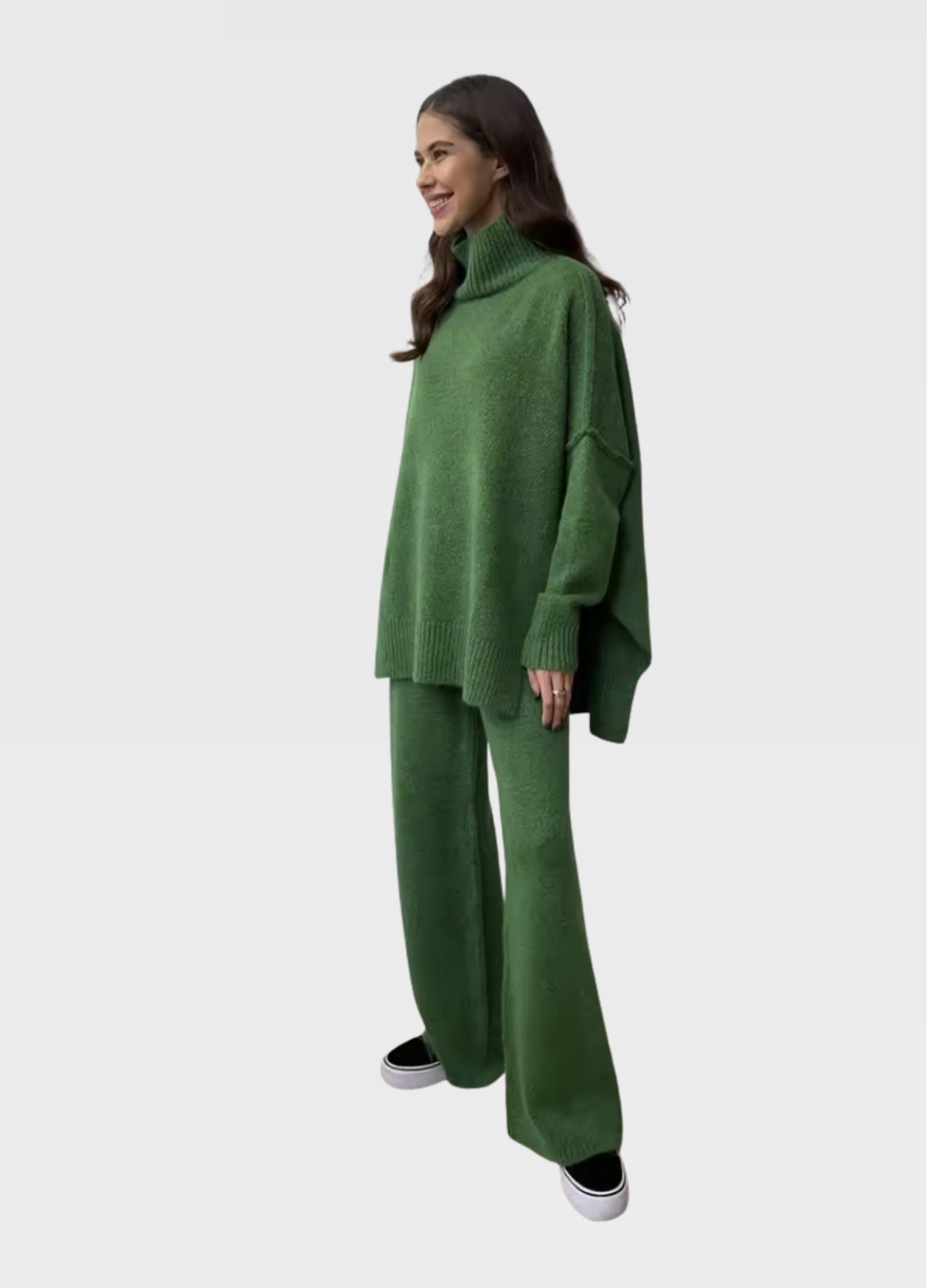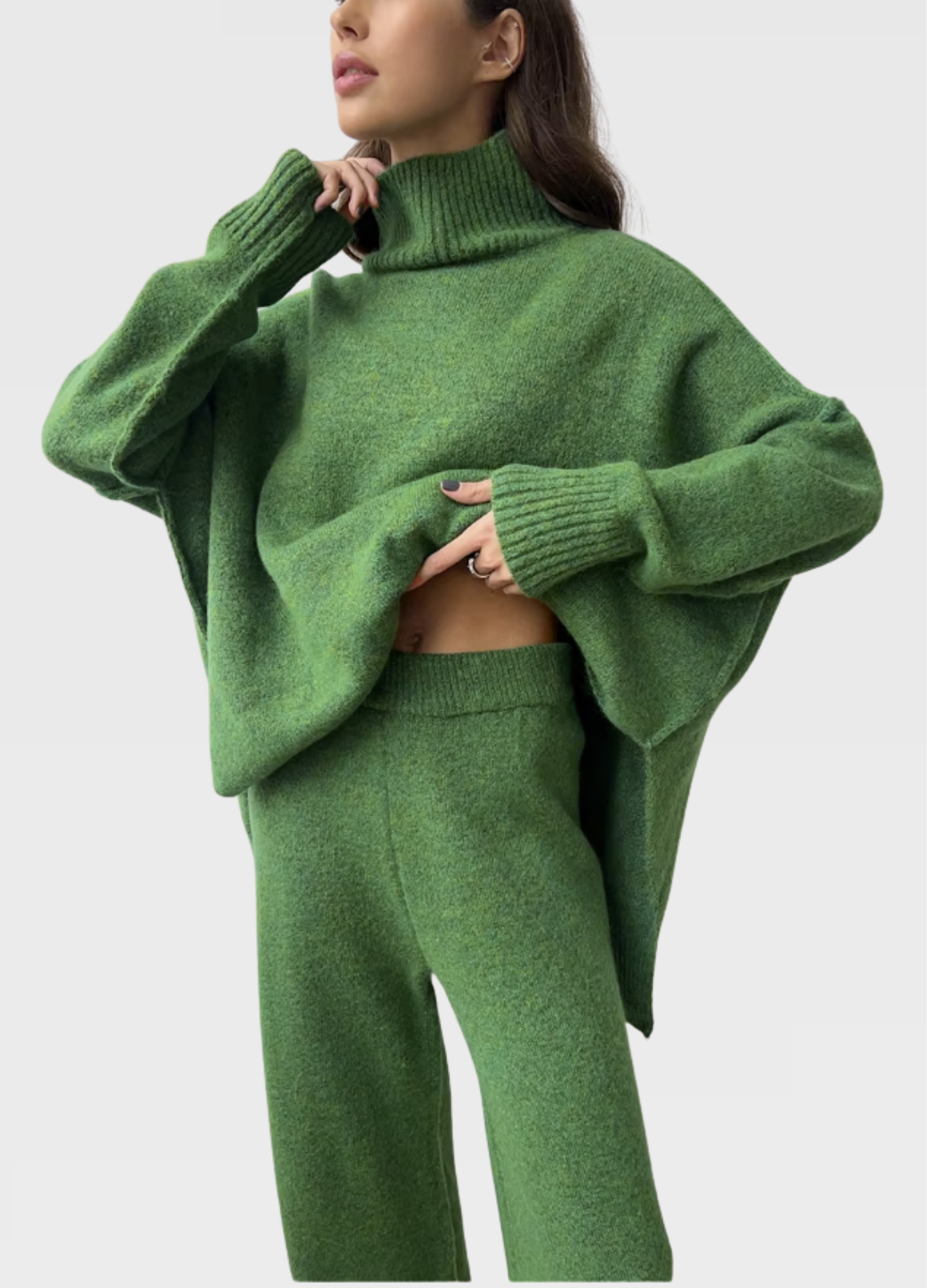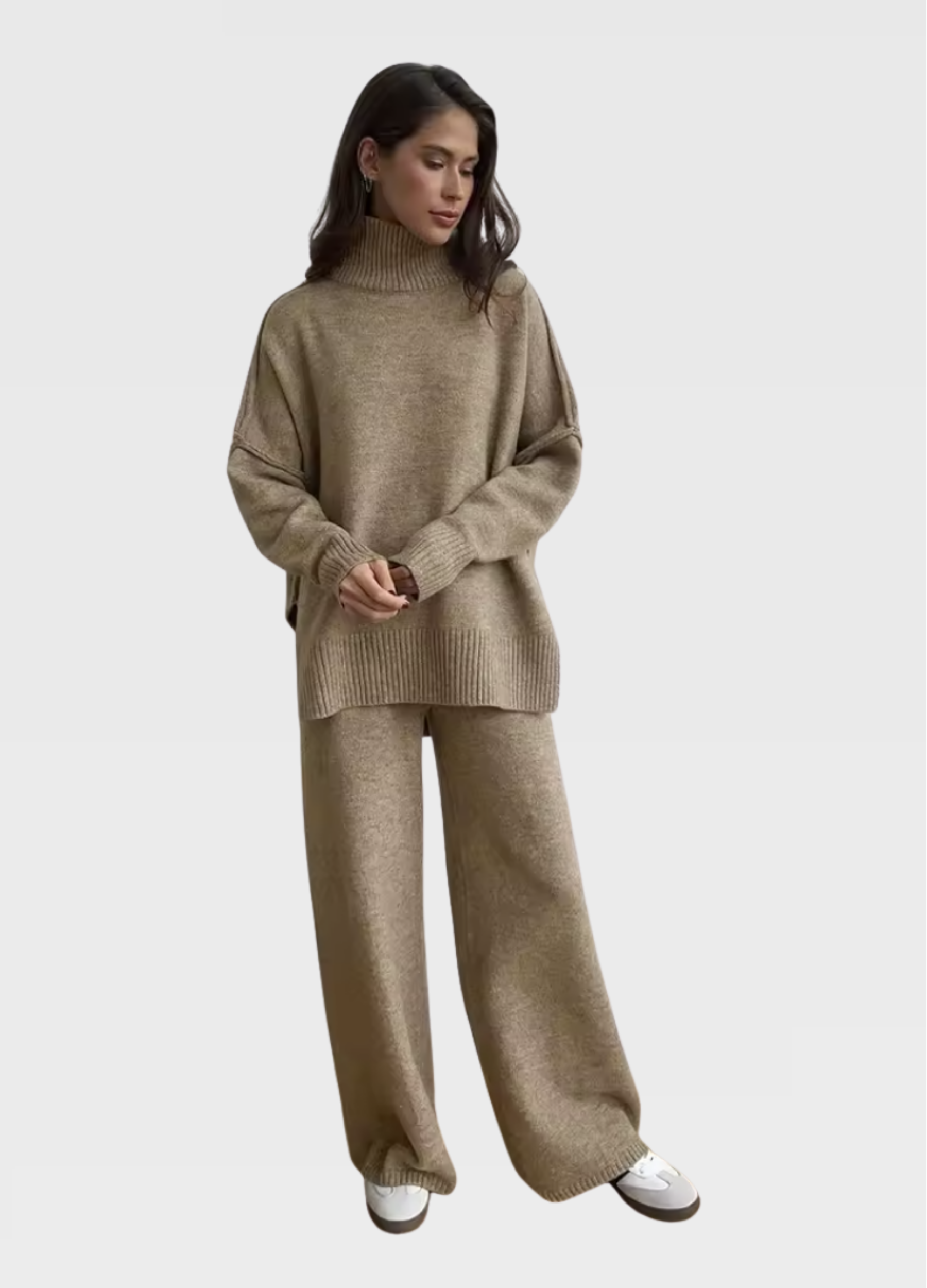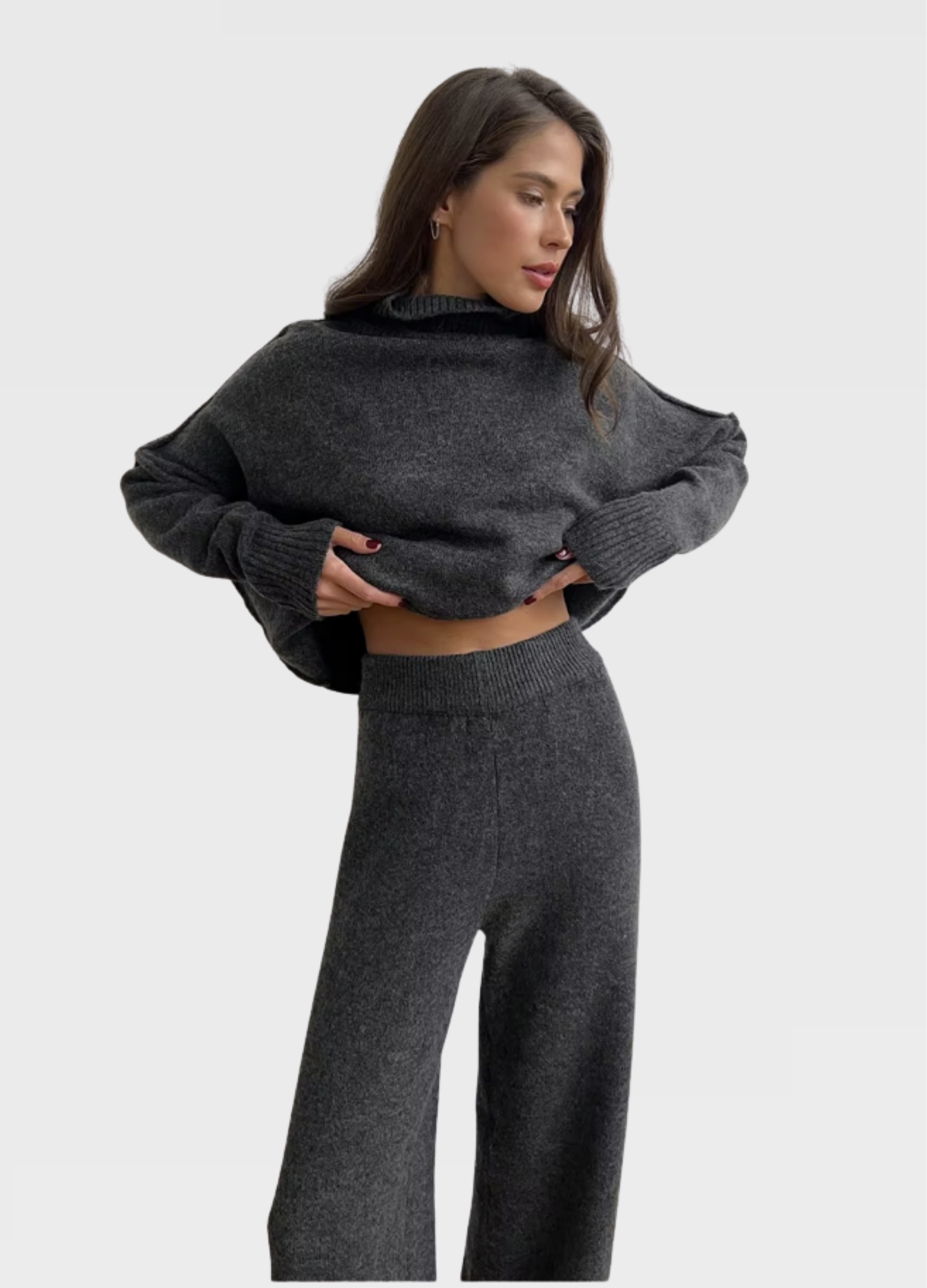 Kvalitná pletenina poskytuje dostatočné teplo bez toho, aby bola ťažká, čo robí túto súpravu ideálnou na nosenie doma aj vonku. Je vhodná na bežný deň, pohodlný domáci outfit či štýlový vzhľad pri rôznych príležitostiach. Súprava pôsobí moderne, nadčasovo a okamžite sa stane obľúbeným kúskom v každom šatníku.